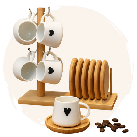 Kit Café em Bambu – 08 Peças + Brinde Especial (06 Xícaras) - Somente hoje