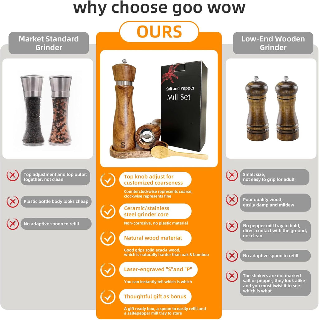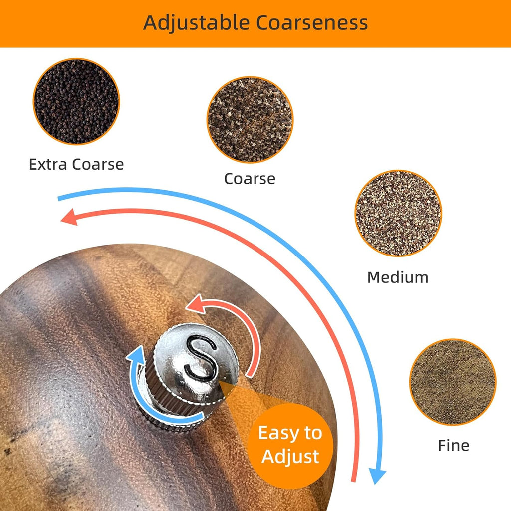 • Moedor de sal recarregável (refil fácil com colher de bônus): o conjunto de moedor de sal e pimenta recarregável apresenta um design simples para recarga sem complicações. Primeiro, encha facilmente o sal marinho ou pimenta preta no moedor de pimenta ou moedor de sal removendo a tampa superior; em seguida, use a colher bônus para reabastecer facilmente o conjunto de moedor de sal e pimenta de madeira. (não inclui sal e pimenta)